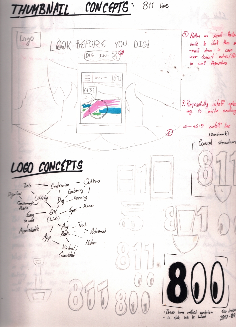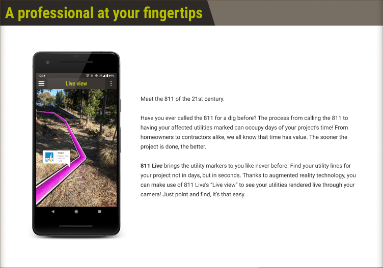 One of the sections in the final mockup. In addition to self made app visuals and selection of choice stock imagery, the production of 811 Live marketing material used platform specific assets, guidelines, and specifications to make for a professional look. You can view the mockup in full here.